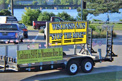 To raise awareness, the Coalition held a rally/picnic/protest/entertainment event on July 28 in Stephenson Island County Park in Marinette on the Wisconsin side next to the Interstate Bridge. This was a collaborative effort with the Menominee Tribe of Wisconsin. Even though the tribe now resides in east central Wisconsin, its origins lie at the mouth of the Menominee River. Their creation myth is centered in the area. Tribal members hold sacred sites along the length of the river, including areas of the proposed mine site. They are completely opposed to the mine and to the potential destruction of their heritage. Guy Reiter, a member of the tribe, has headed their opposition with significant support from his tribal members.
