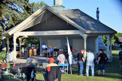 Musicians perform on the pavilion stage at Stephenson Island Park, Marinette, Wis., while participants gather for the evening rally.