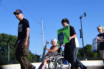 Water protectors display signs about the dangers of the proposed Aquila Back 40 sulfide mine, intended to mine for gold and other minerals. Cyanide is used to dissolve and separate gold from ore.